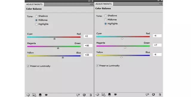做一个色彩平衡调整图层,改变中间色调和亮点的设置: