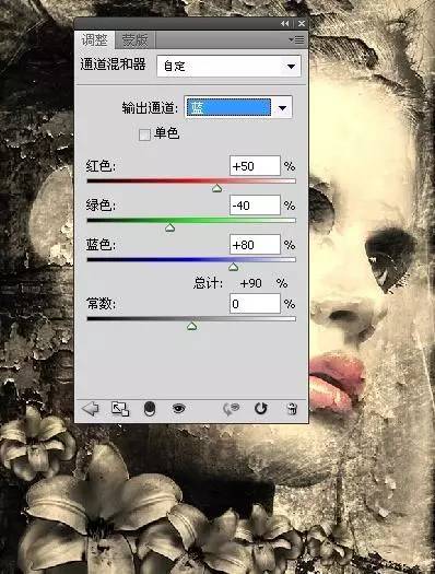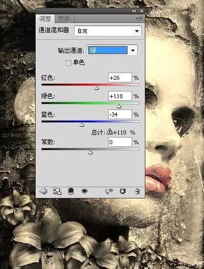 (18)单击创建新的填充或调整图层,在弹出的菜单中选择通道混合器命令,设置弹出的对话框如图26、27、28所示,得到如图29所示效果。