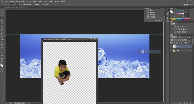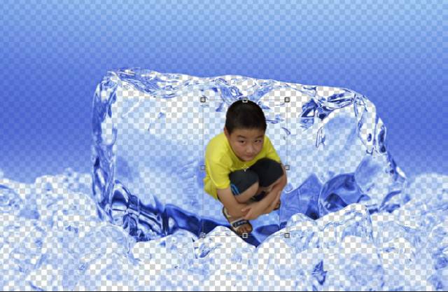 但是一般而言人是会比冰大出好多好多的,就用移动工具,即左边工具栏的第一个图标是鼠标的,选中人像图层,人像周围会出现用来调节大小的框点。
