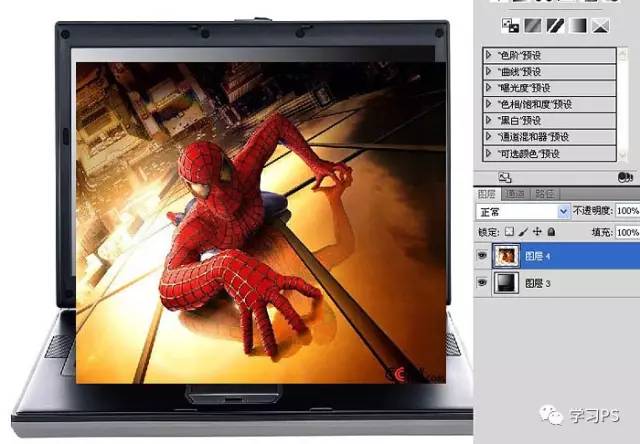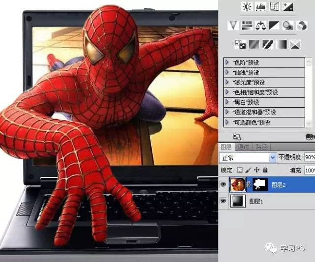 6、从路径里先后复制屏幕和手头肩膀的选区,给蜘蛛侠添加蒙版。