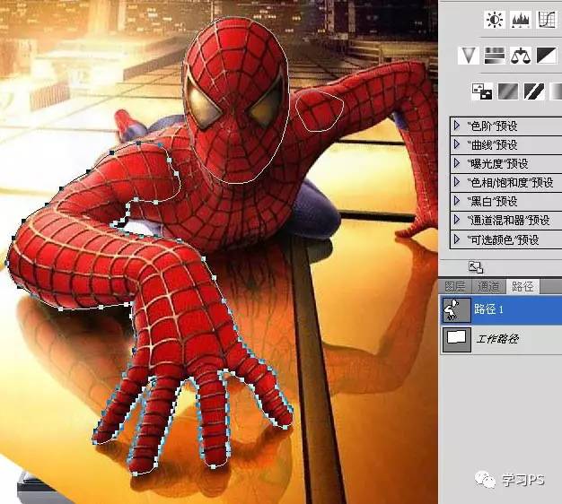 5、新建一个路径层,继续描伸出屏幕外部分的蜘蛛侠,手指哪里比较花功夫。其实不用很精细,因为到后期我会用蒙版做微调。