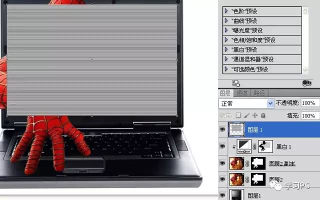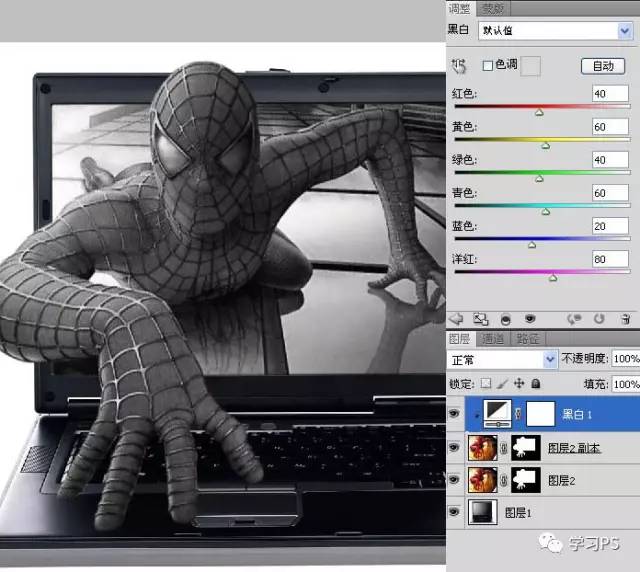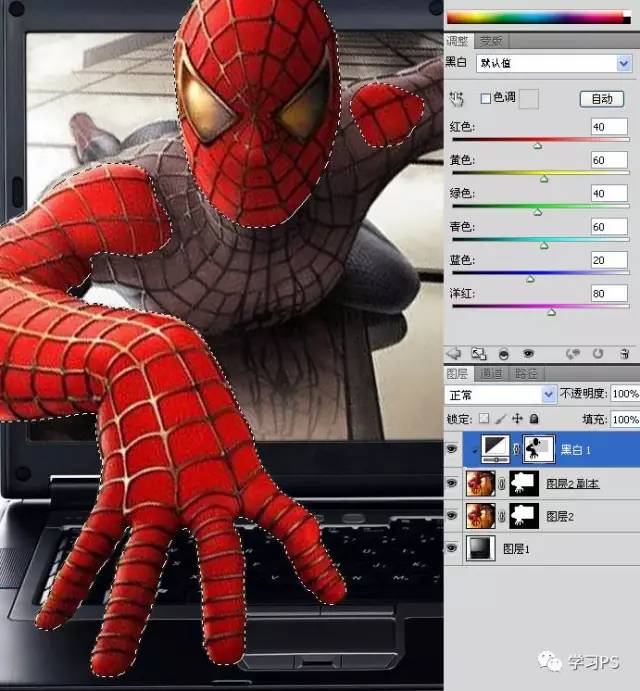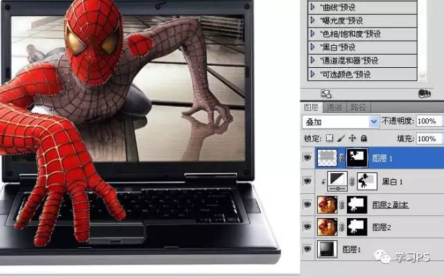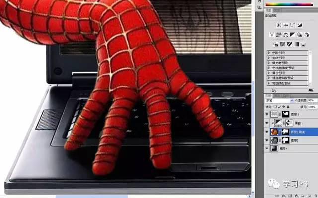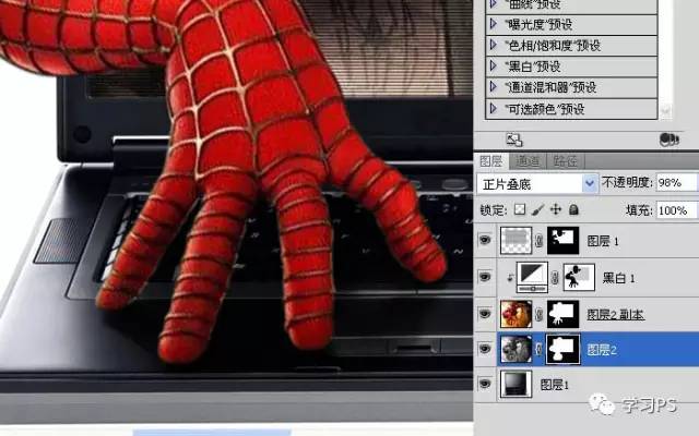 15、把底层的蜘蛛侠去色,在蒙版中用白色低透明度的画笔把手的阴影和倒影仔细的涂出来。
