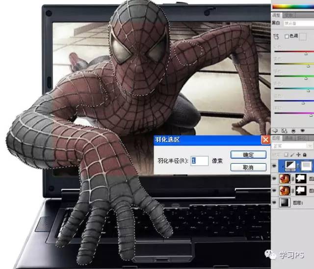 16、由于钢笔抠得不是很细致,彩色层蜘蛛侠的手指周围还有一些浅色的毛边,同样在蒙版里用黑色小画笔仔细擦除。