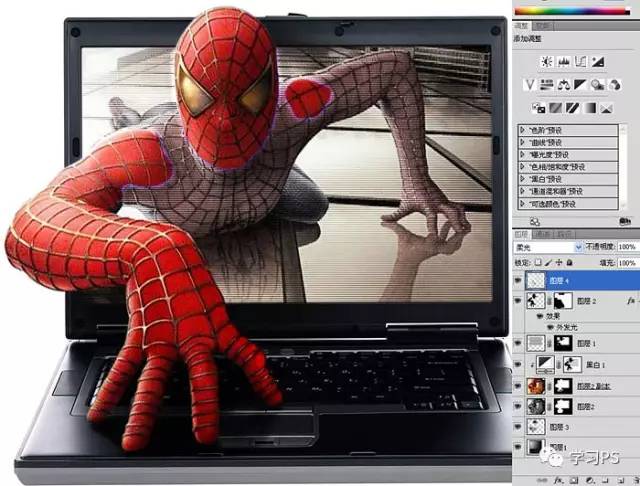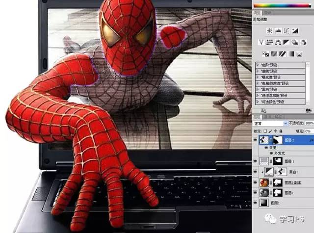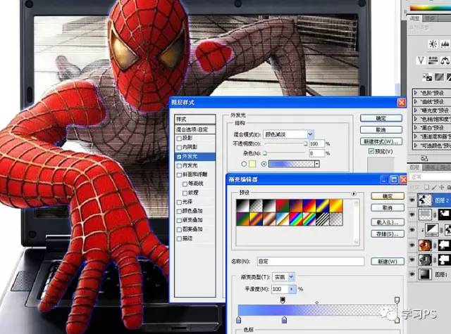 18、添加渐变外发光,这里我要制作蜘蛛侠钻出屏幕部分的截面跟显示器摩擦产生的电弧光的效果。