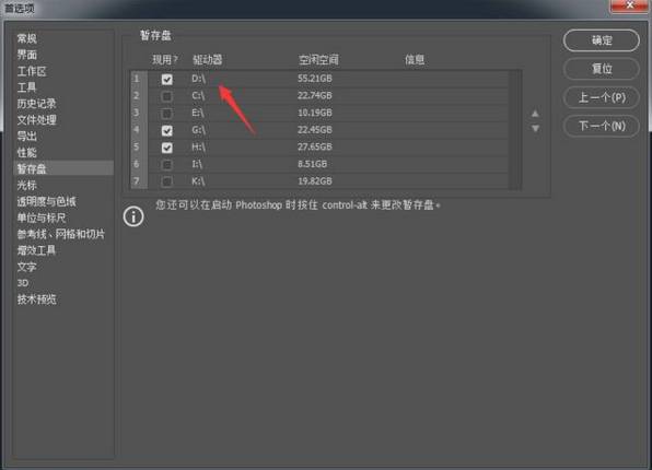 这个设置规则很简单,不要设在C盘,C盘是系统盘,在电脑运行时是很忙地,选一个空间大的空闲盘做暂存盘会加快操作速度,当然多选几个也可以。如果你电脑上配有固态盘和机械盘,暂存盘一定要设在固态盘上,道理显而易见。