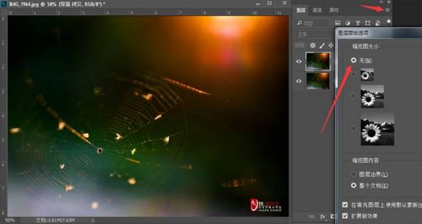 在图层面板中,每一层都会有一个当前图层的缩略图,让你能快速的找到并分辨出哪一层。但这个缩略图是很占用内存的,我们可以关闭这个缩略图。如图示: