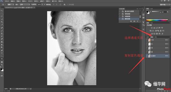 接下来,选择复制出的图层1,点击进入通道页面,选择蓝通道,复制蓝通道图层,得到蓝副本。这一步需要说明的是复制蓝通道图层是因为在本张图片里,蓝通道下的图层中模特雀斑和肤色的对比最为明显。以后大家在修图的时候注意观察一下,在选择通道时要本着需要去除的部分和原本肤质在哪个通道下的对比最大的原则去复制。
