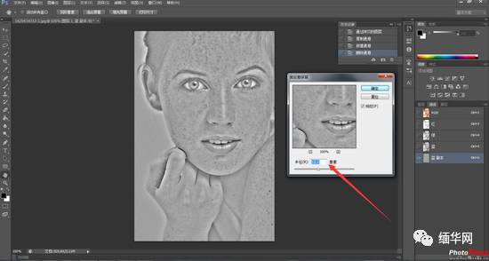 点击确定后,利用滴管工具(快捷键I)拾取面部正常肤色的部分,然后选择画笔工具(快捷键B),在图中用画笔涂抹除脸部以外的部分(眼睛、眉毛、嘴、头发以及手指关节),目的是让这些不需要磨皮的部分不受后面动作的影响。完成后得到如下结果: