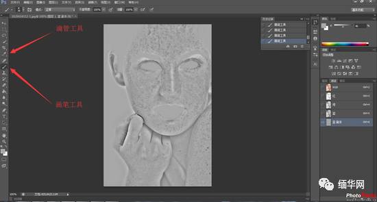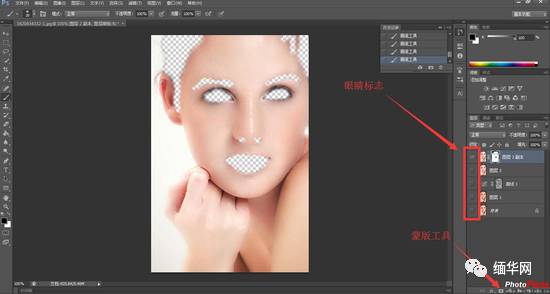 选中刚刚复制出的图层2副本,点击蒙版工具为图层添加蒙版,用黑色画笔把眼睛、嘴、眉毛、头发以及手指关节处涂抹盖住。在涂抹时,把除了图层2副本以外所有图层前面的“眼睛”标志全部关闭,就能看到涂抹效果,如下图所示: