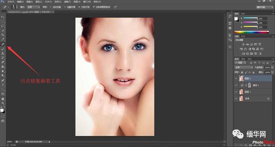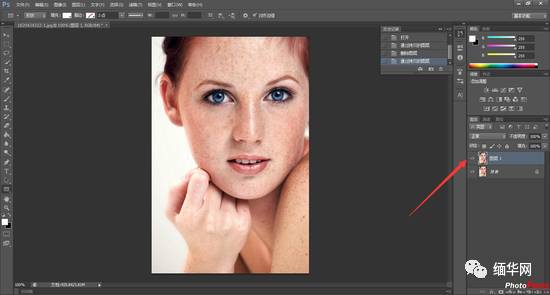 现在我们已经能看到基础效果,模特的大部分雀斑都已经依靠以上的步骤得到了消除。接下来,让我们来进行一些细节上的调整,让效果更加完美。