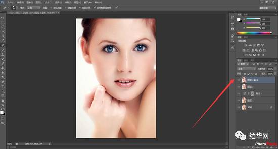 修复完成后,按Ctrl+J快捷键将刚才手动修复完较为明显的遗留瑕疵的图层2复制一层,得到图层2副本。