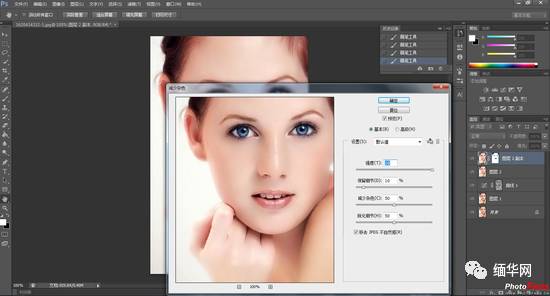 涂抹完毕后,点击已经完成蒙版的图层2副本,依次点击页面上方导航栏中的滤镜——杂色——减少杂色动作选项,数值按个人喜好进行调整。