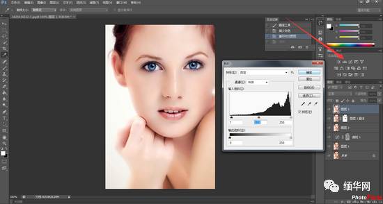 最后一步,选择刚得到的图层3,点击色阶工具,利用它将模特的肤色略微提亮,让肤色表现更白嫩。