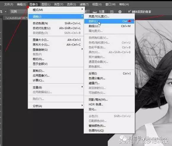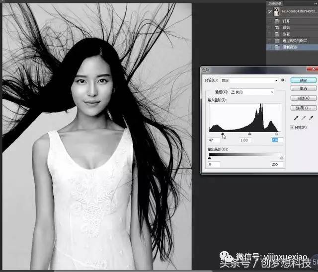 4.打开色阶之后会看到一个小面板,这个小面板在通道抠图中也是一个相当重要的一个组件。使用Photoshop色阶功能将对比度调节的更高一些,以方便下一步操作。(这个时候就要注意头发丝那些会被刷没了)