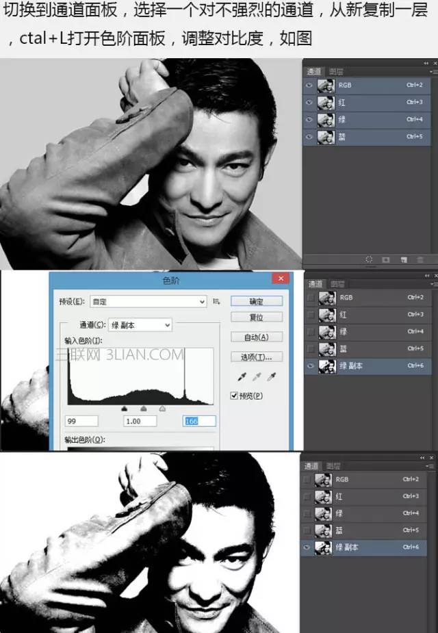 2、切换到通道面板,选择一个对比不强烈的通道,重新复制一层,Ctrl + L 打开色阶面板,调整对比度,如下图。