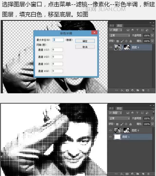 5、选择图层小窗口,点击菜单:滤镜 > 像素化 > 彩色半调,新建图层填充白色,移至底层,如下图。