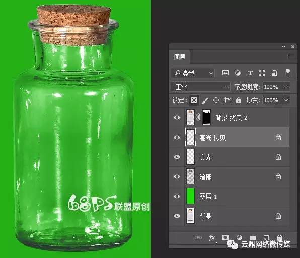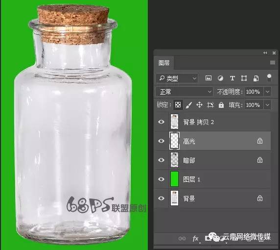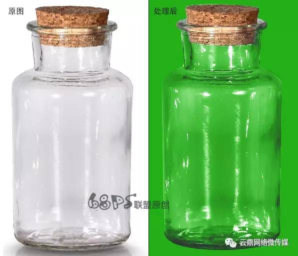 | 9、到这里一个透明的玻璃瓶就抠好了,如果觉得高光部份不够亮,我们可以再复制一层高光,这样效果就更好了。 |