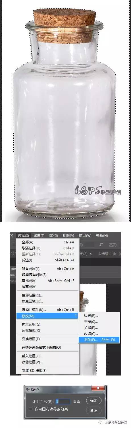 | 3、Ctrl+Shift+I反转选区,点选择-修改-羽化,羽化1个像素,按Delete键删除选区。 |
