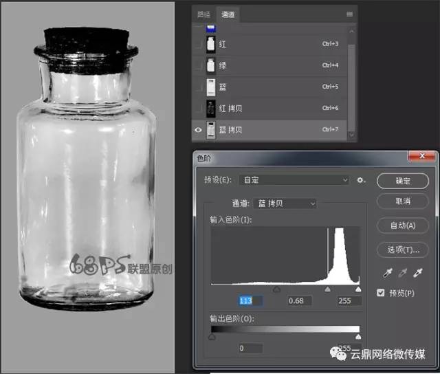 | 6、再次转到通道面板,复制蓝色通道,Ctrl+L打开色阶,调整色阶,使暗部更暗,亮部更亮。按Ctrl键点击复制的蓝色通道,复到选区。 |