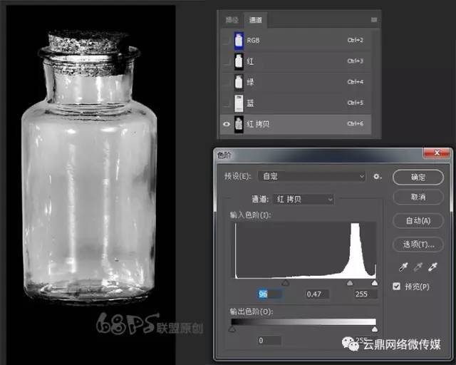 透明琉璃瓶在图片制作中用到的地方很多,它的外型是比较明确的,只要运用钢笔工具,就可将它的范围截取出来,但由于它是透明物体,所以在拍摄的过程中,通常都会运用深色背景作衬底,来突显透明的感觉,这里我们运用通道抠选出透明的玻璃瓶,在制作时反复利用通道,配合“色阶”命令,制作出玻璃瓶的高光和暗部的选区。 |