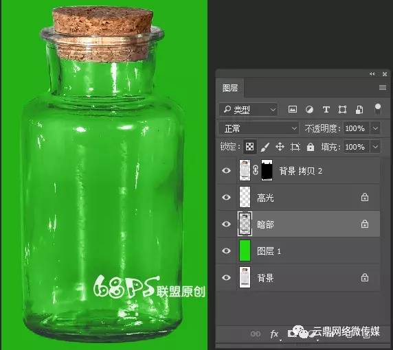 | 8、把原玻璃瓶图层移到所有图层的最上方,并添加图层蒙版,用画笔工具(B)把瓶盖单独抠出。 |
