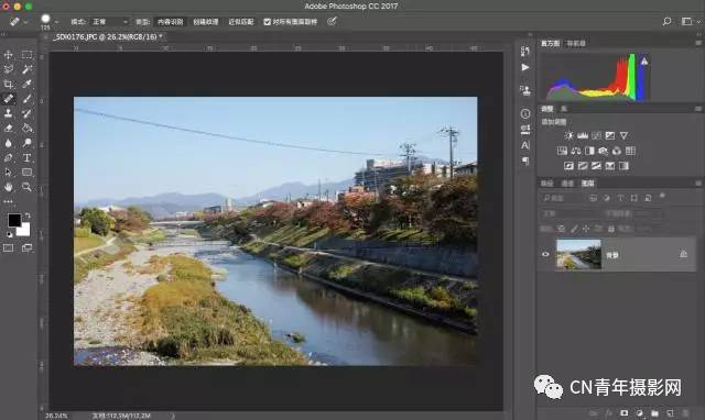 步骤概述:照片打开 > 新建图层 > 去除电线 > 盖印图层 > 转换为智能对象 > 影调处理 > 保存照片