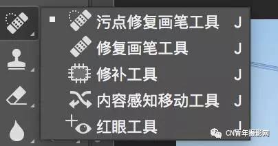 现在我们在工具栏里选择污点修复画笔工具(图标为下图第一个,如果你找不到,可以通过右键单击以下任何图标,调出这个菜单,并选择它),我会用它来去掉电线。