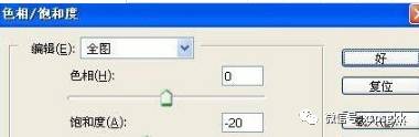 8、单击图层面板下方的“创建新的填充或调整图层”按钮,在弹出的快捷菜单中选“色相/饱和度”命令,在弹出的饱和度对话框中设置饱和度为-20