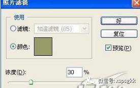 13、单击图层面板下方的“创建新的填充或调整图层”按钮,在弹出的快捷菜单中选“照片滤镜”命令,在弹出的对话框中选择颜色,设置颜色RGB为153、153、102