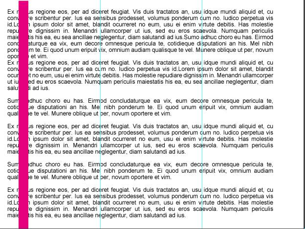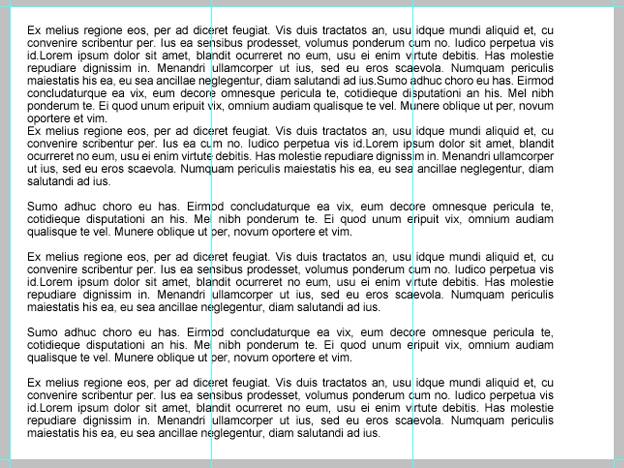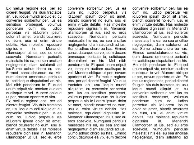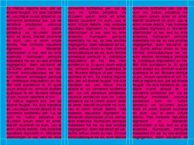 现在,我们来用真实案例来说明一下参考线的益处。比方说常见的三栏式布局,在文本与页面边缘之间需要留出一点留白区域。同样的,栏与栏之间也需要留白区域。总而言之,我们最后想要这种文本布局。