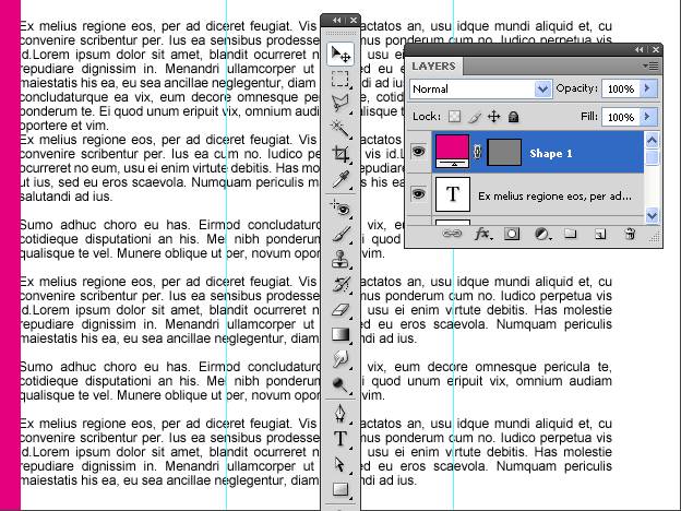 创建留白区域: 现在需要给栏与栏之间创造一点留白区域。使用矩形工具(Shift+U),在想要设置留白区域的地方画出形状,我使用了品红色,这样比较容易辨识。