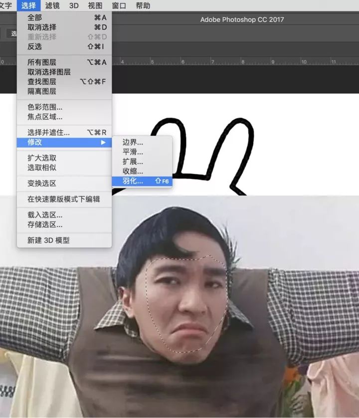 由于选区不太合适多出来的部分我们得删除,选中多出来的头发、脸等不需要的区域,给5-10的羽化。然后删除。使用羽化能减少瑕疵,如果直接删除会有明显的界限,调图不太完美的时候是能看到的,使用羽化后,即使不完美,也是个渐变的过程,不会看到瑕疵。