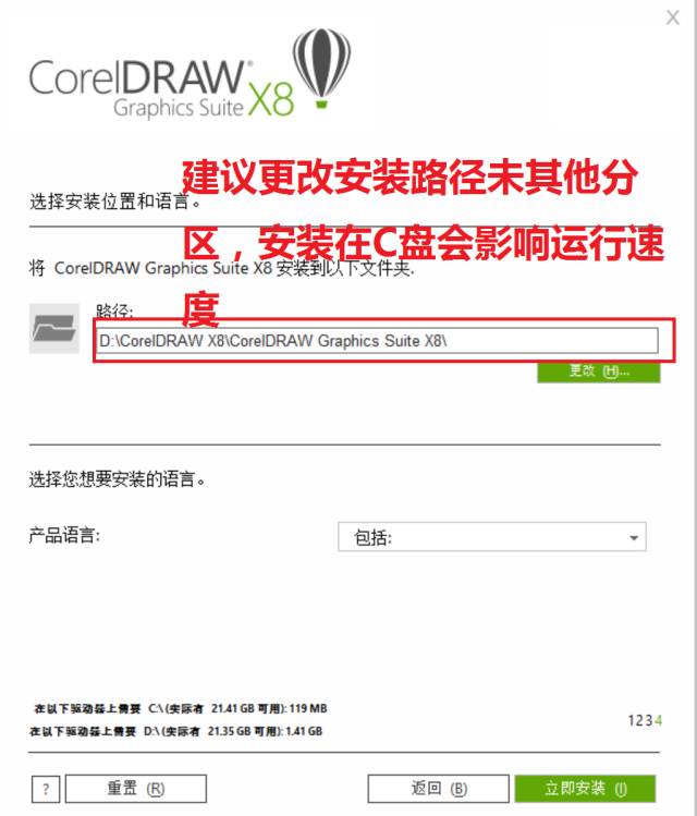 这里建议更改安装路径到其他分区,安装在C盘会影响运行速度