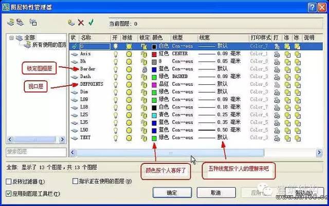 3、对象属性(颜色、线型、线宽)一律随层,便于修改对象。