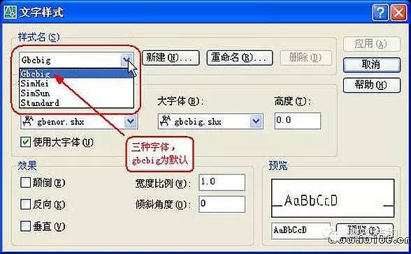 4、文字样式名称最好用大字体本身的文件名,便于识别,例如:文字样式gbcbig,表示gbcbig.shx+gbenor.sh,simsun表示simsun.ttf,simhei表示simhei.ttf。