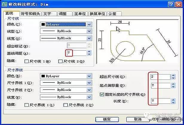 3、标注样式中的各种数量(指箭头大小、基线间距、文字高度等)设置,无论是布局(图纸空间)出图,还是模型空间出图,均采用实际图纸(指打印出来的A2、A3图纸)中的大小。比方说实际图纸中文字高3.5mm,那就设3.5。