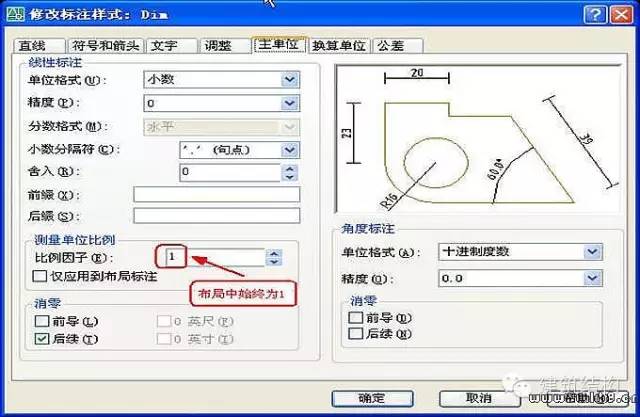 注:关于标注样式的设置,我建议只设一种,一是简单,只有一个标注样式,就基本上可以解决所有的标注情况,一劳永逸,二是不需要换算那讨厌人的比例,不容易出错。