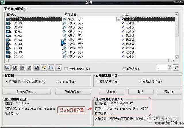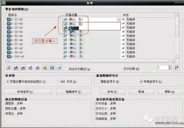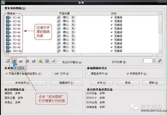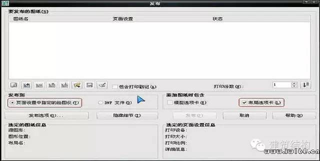 见下图,注意“发布到”选择“页面设置中指定的绘图仪”,且“添加图纸包含”选择“布局选项卡”。默认“模型选项卡”也是打钩的,我们这里是打印布局,不是打印模型,所以取消它。