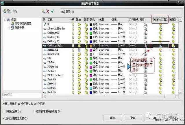 这是一个很重要的功能,比如可以利用此功能将平面布置图及顶棚平面图中的对象画在一个房间平面内,然后在布局中开两个视口(当然不在一个布局中也可以),分别显示平面布置图而隐藏顶棚平面图的对象(如灯具)和顶棚平面图而隐藏平面布置图的对象(如家具),以达到各取所需的目的。