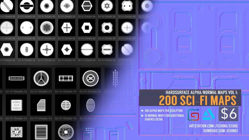 190 张 Alpha 贴图的集合,用于在 Zbrush 中进行硬表面建模和雕刻。