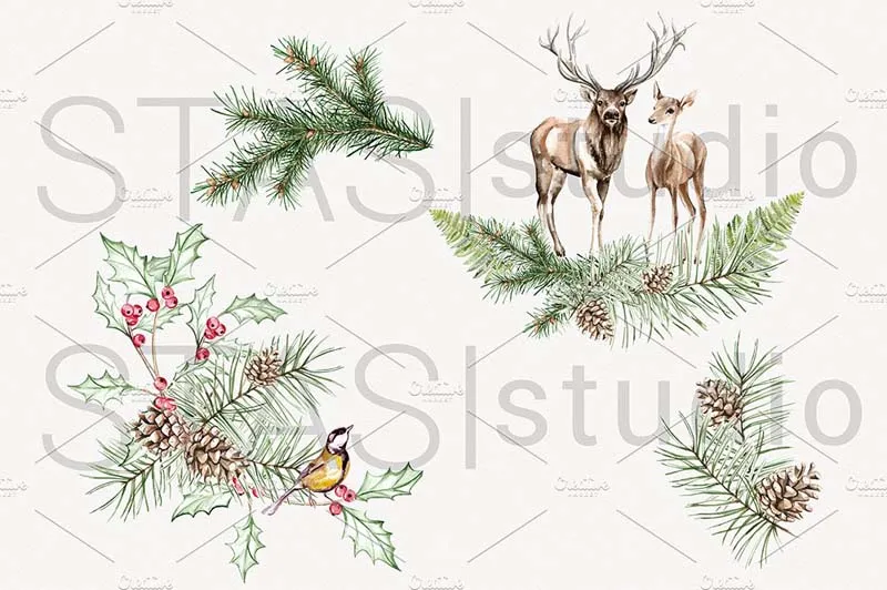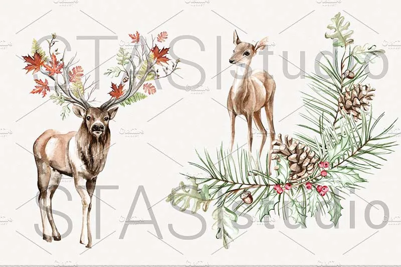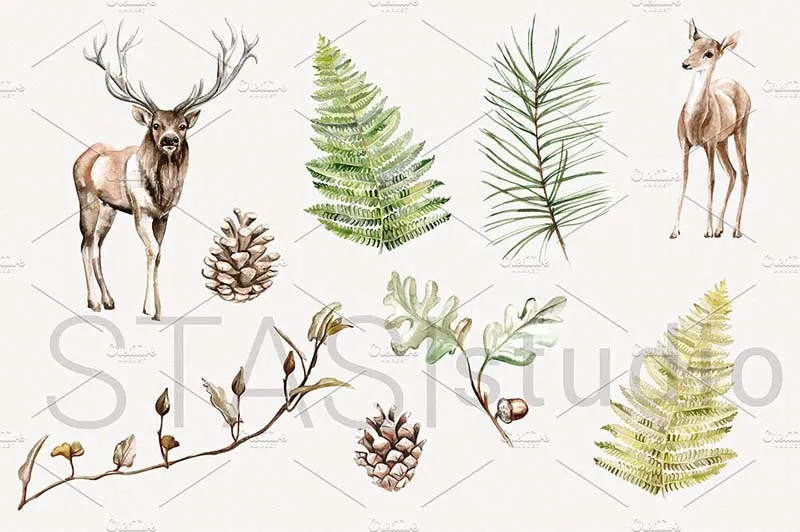 小鹿水彩剪贴画,鹿角剪贴画水彩驯鹿,森林剪贴画,DIY包,花卉规划师图松果剪贴画