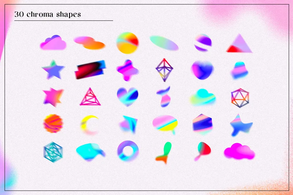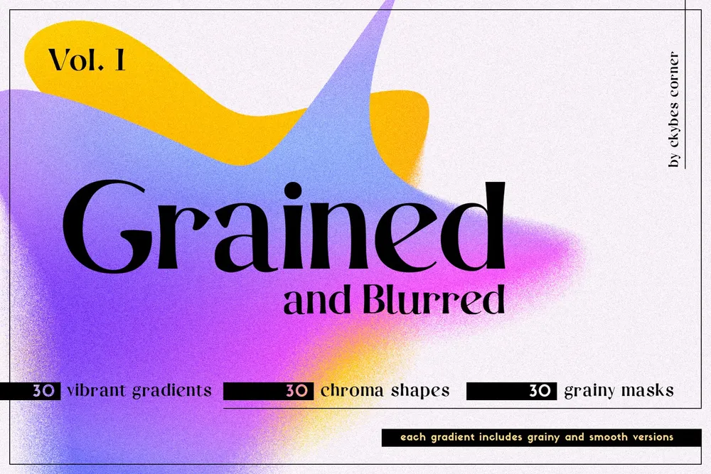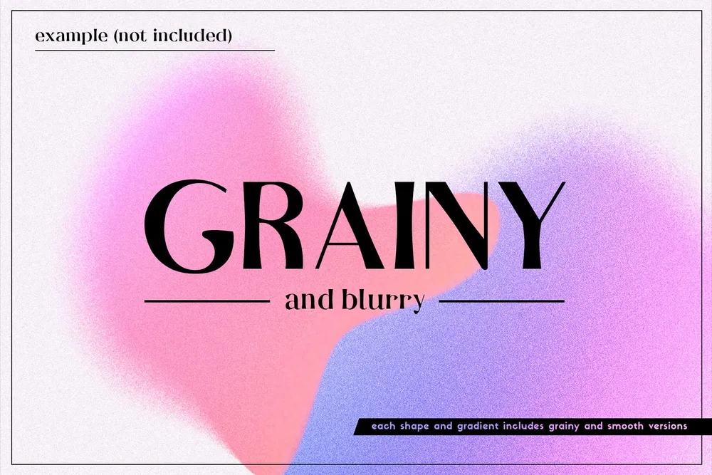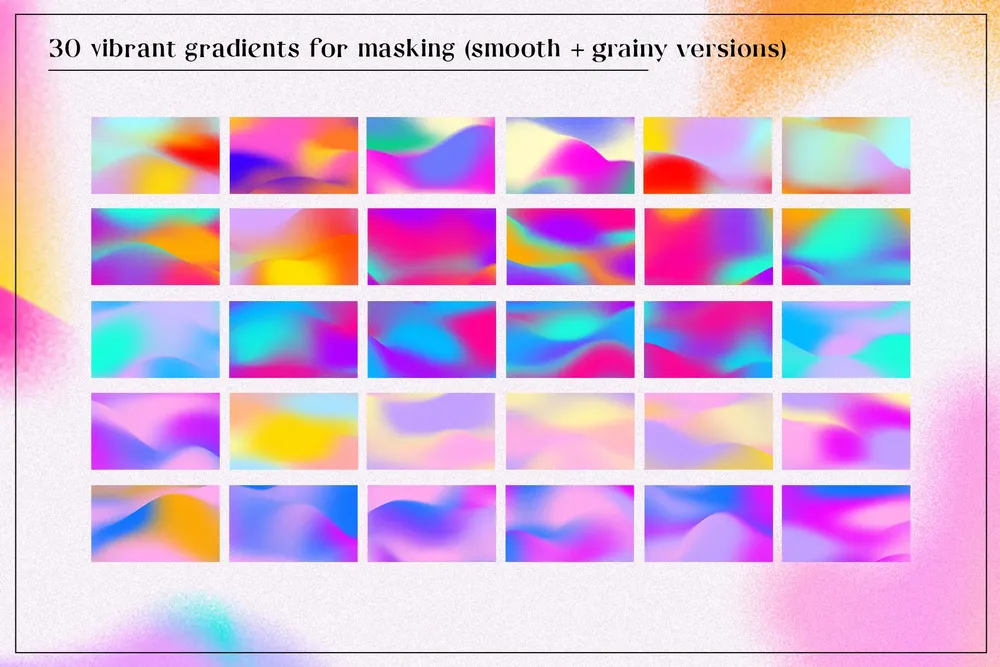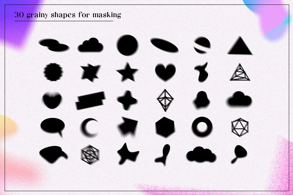 颗粒感和模糊效果 – 30个元素套装,包含大量颗粒感和模糊的抽象形状,用于制作时尚的复古设计。它还包含预制的彩色颗粒形状和美丽的渐变套装。因此,你可以轻松创建无限变化的时尚复古波设计。只需将你喜欢的形状放在你喜欢的渐变上,然后按Cmd(PC上为Ctrl)+鼠标左键。之后按Cmd(PC上为Ctrl)+ Shift + I,然后按Backspace删除不必要的部分。以下是你在本套装中找到的内容:
