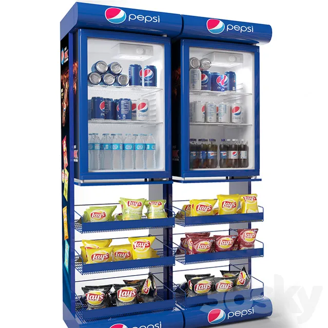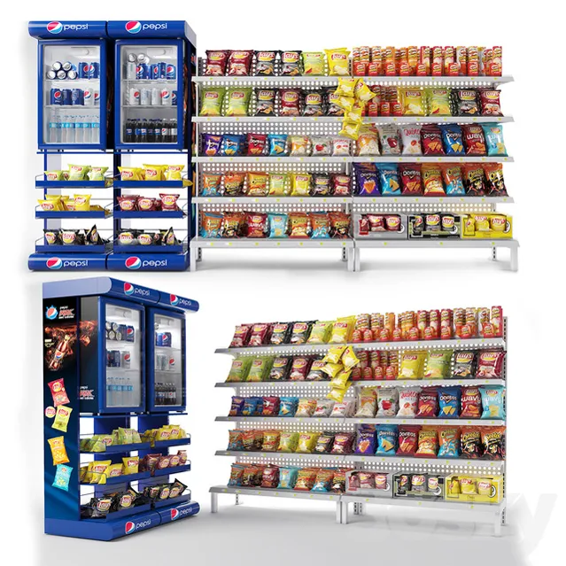 购物中心展示架上装有土豆产品(Lays-doritos,cheetos,pringles .....)百事可乐冰箱和