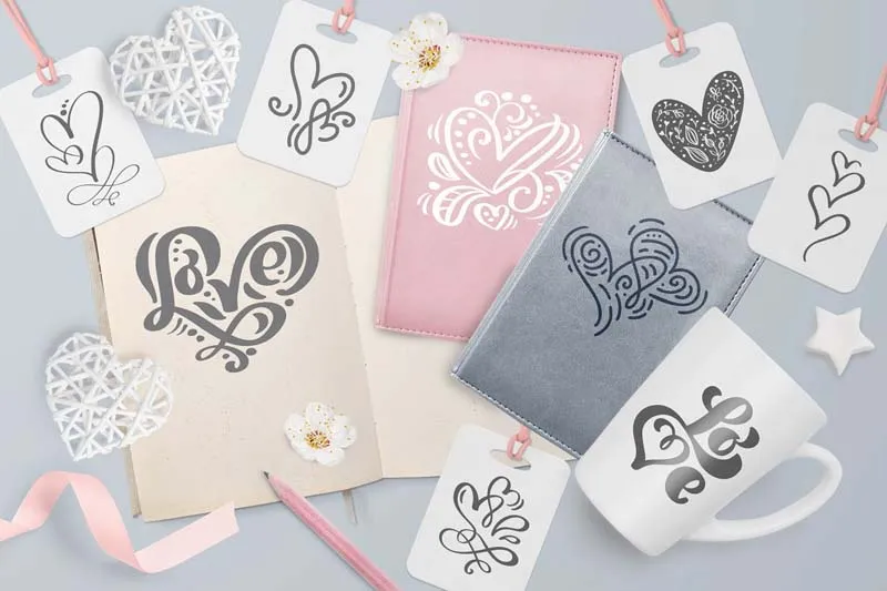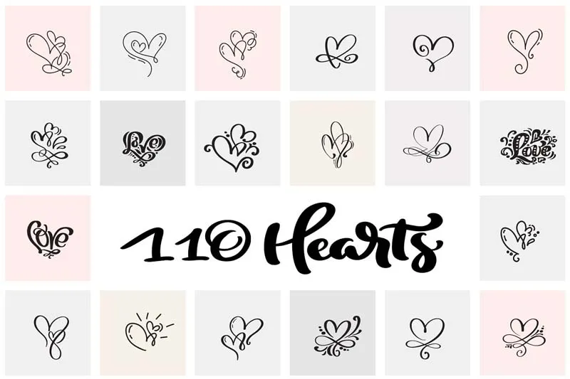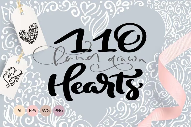 情人节手绘矢量爱心素材包,帮你创建一个可爱的贺卡,精彩的婚礼请柬,仪表板和贴纸!它包括110个矢量书法情人节的心形设计。全部为EPS,AI,SVG和PNG文件。