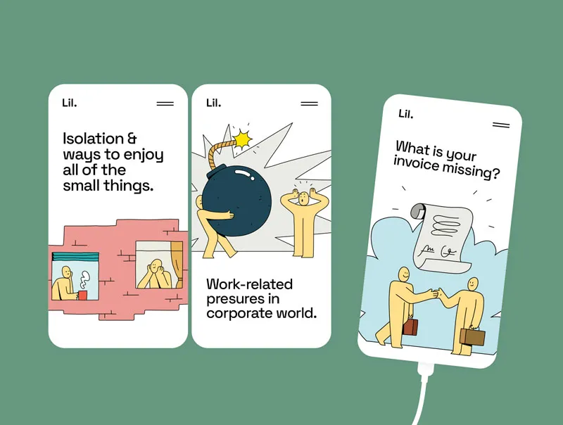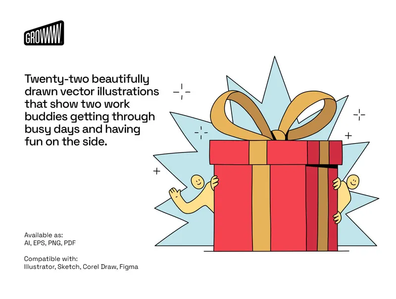 22个精美绘制的矢量插图,显示了两个工作伙伴度过忙碌的日子并在一边玩得开心。