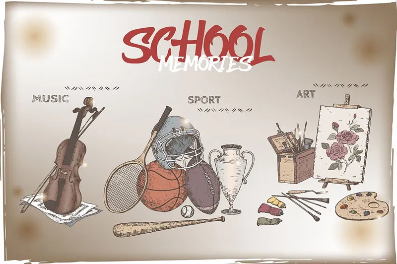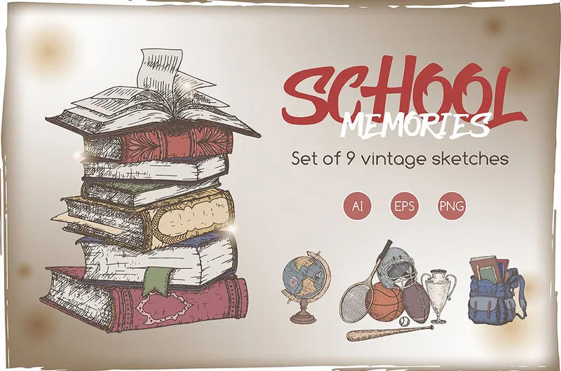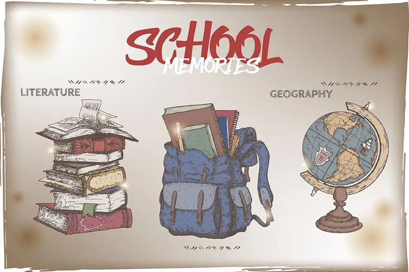 我们中的许多人对我们的学生时代都有美好的回忆。 这些复古草图将有助于唤起和与朋友和客户分享这些回忆。 人们可以在宣传“返校”销售、大师班或特殊活动时使用它们。 您还可以将这些插图用于装饰目的,如复古海报或贺卡。