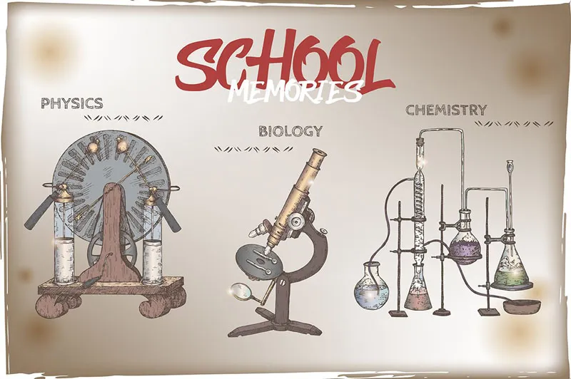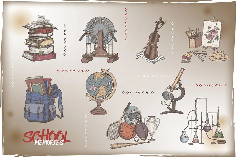 本产品包括以下插图:书架、背包、地球仪、化学设备、运动装备、带音符的小提琴、美术用品、发电机(又名 Wimshurst 影响机)和显微镜。