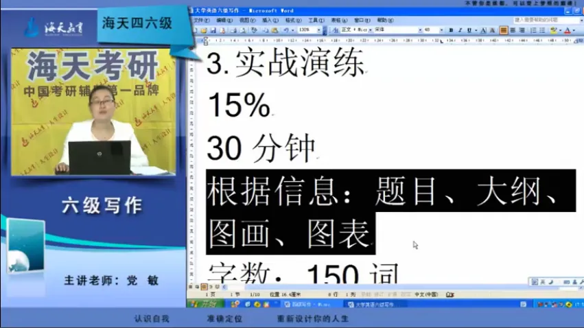 根据全国大学英语四、六级考试委员会2006年11月出版的《大学英语六级考试大纲(2006修订版)》:写作部分所占分值15%。要求考生在30分钟内根据规定的题目和所提供的提纲、情景、图片或图表等,写出一篇不少于150词的短文。写作选用考生所熟悉的题材,要求思想表达准确、意义连贯、无严重语法错误。