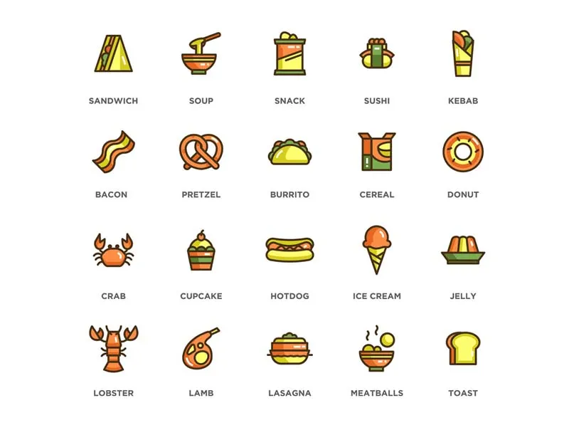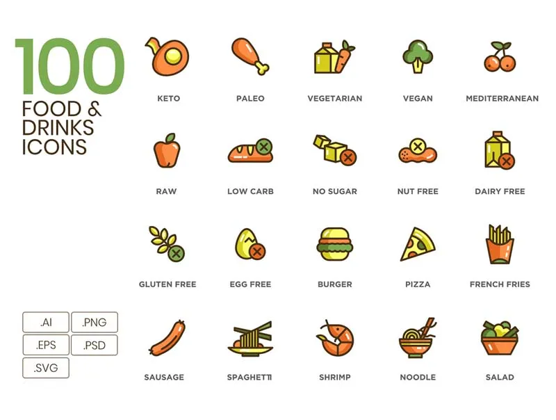如果您想进入食品行业,也称为餐饮行业,我们为您提供完美的图标集!这100个食物和饮料图标供您探索!如果您想开创自己的事业,或者即使您只是为未来的客户设计菜单,这些食品和饮料图标将帮助到您!