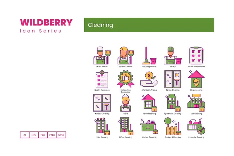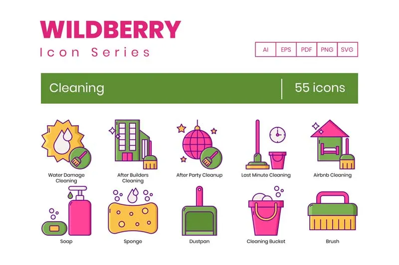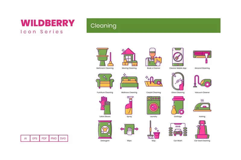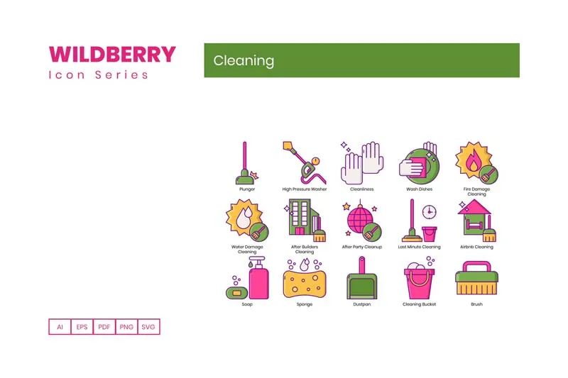 这个来自Wildberry系列的清洁图标集包括: